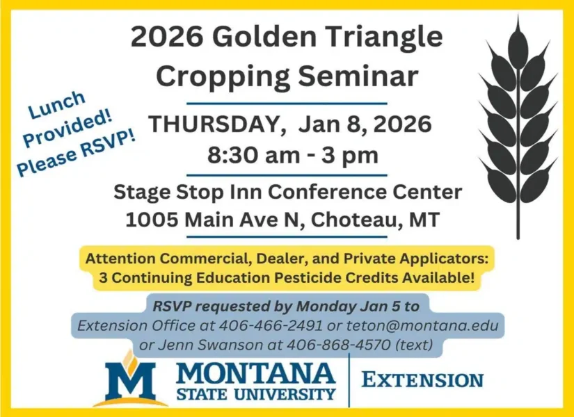 Montana State University (MSU) Extension will host its annual cropping seminar series January 5-9, 2026, in the Golden Triangle area....