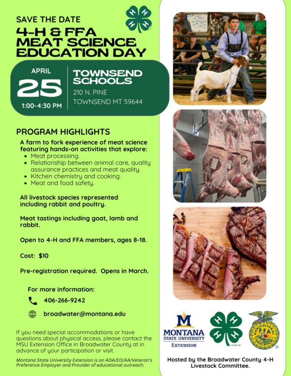 The Broadwater County 4-H Livestock Committee is hosting a 4-H & FFA Meat Science Education Day on Saturday, April 25...